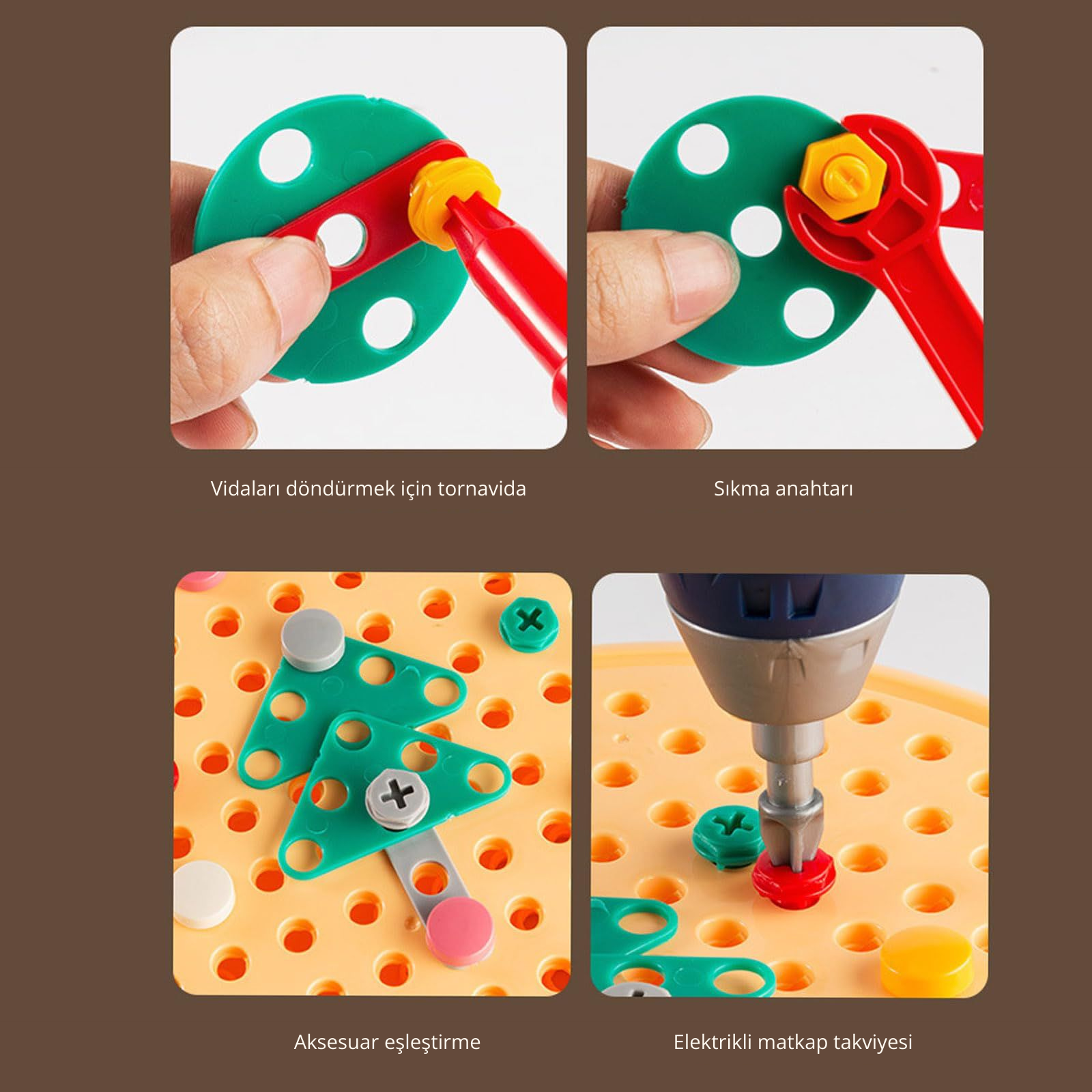 203 parçalı eğitici STEM mozaik yapı ve matkap seti çocukların hayal gücünü geliştirmesi için tasarlanmış eğitici bir alet setidir. Renkli mozaik yap-boz, vidalar, somunlar ve güvenli oyuncak ama çalışan matkap sayesinde çocuklar kendi tasarımlarını hızla ortaya çıkarabilir. Eğlenceli olduğu kadar öğretici olan bu set, problem çözme yeteneklerini geliştirmelerini sağlarken el–göz koordinasyonunu da destekler.